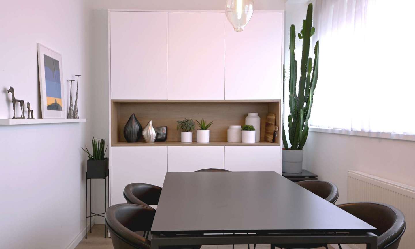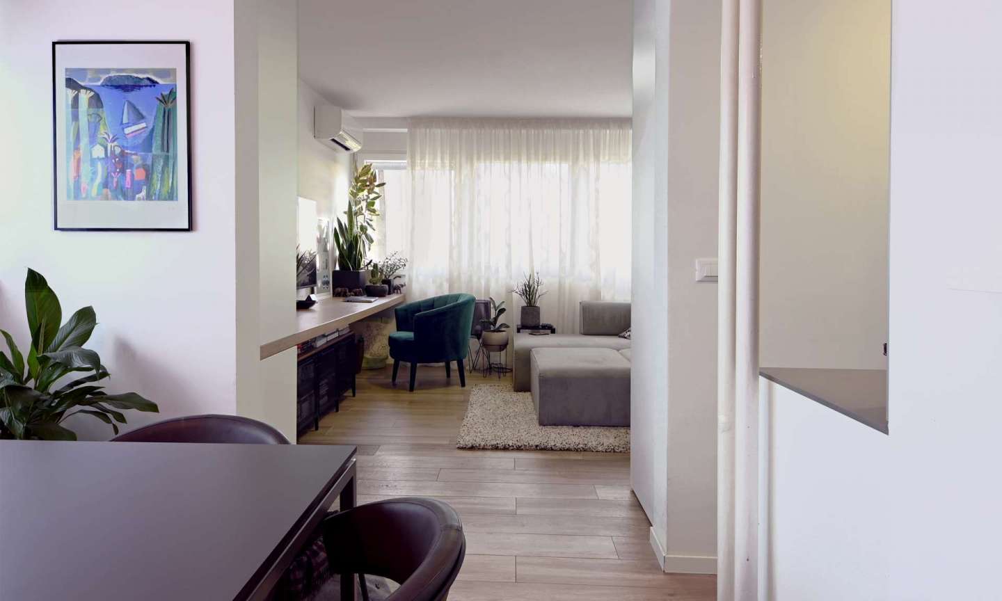 Fleksibilan, dobro osvijetljen i dvostrano orijentiran postojeći stan, jednostavnom je intervencijom prenamijenjen - sukladno trenutnim potrebama korisnika - u dva manja: dvosobni stan i garsonjeru. Minimalistički opremljen interijer i maksimalno iskorišten prostor za odlaganje, afirmiraju prilagodbu stana životnom ciklusu mlade obitelji. Izmicanjem jedinog pregradnog zida i prenamjenom prostorija / premještanjem namještaja, stan se ponovno koristi u cjelini, kao trosobni ili četverosobni.