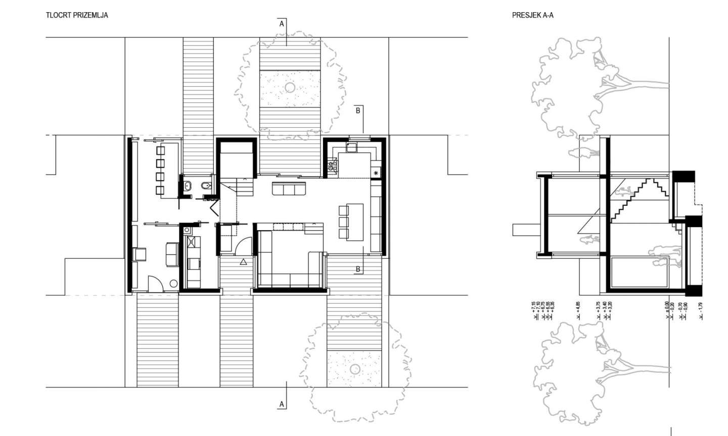 Definirajući prostorni okvir naselja, definirana je i stambena jedinica. Funkcionalne trake meandriraju oko osi zajedničkog krova, stvarajući manji natkriveni vanjski prostor, koji postaje mjesto za stol, mjesto za ulaz ili odmor. Ovisno o funkciji i potrebnoj intimi, trake se zatvaraju s jedne strane, a s druge nastavljaju na parcelu u obliku drvene palube.